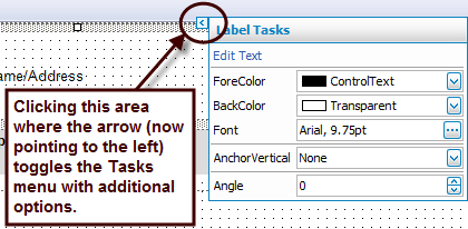 In the image above, the arrow points to the left. When the item is selected, this arrow points to the right and the task menu does not show. Click the arrow, however, and you will get a menu like the one above to appear. This menu lets you apply characteristics that are only specific to the item selected on the form.