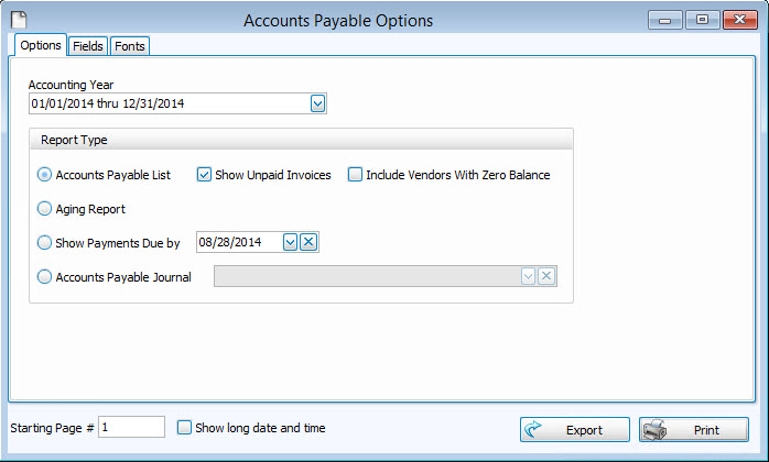 Shows all the invoices due by the specific date. Specify the date by clicking the dropdown box next to this option and selecting the date. - Accounts Payable Journal: