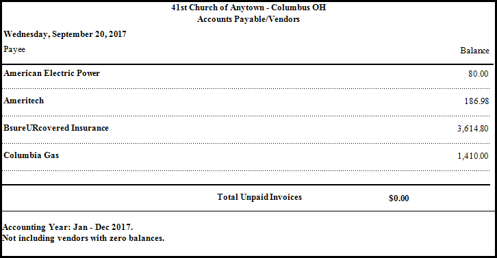 Shows a complete list of vendors / payees and their balances. If you place a checkmark in the Show Unpaid Invoices box, the list will also show the invoices. If you place a checkmark in the Include Vendors With Zero Balance box, the list will show invoices for vendors that owe your organization $0.00. - Aging Report: