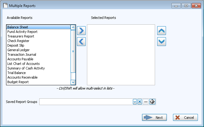 In Church Windows Accounting, you have the option to either run each report individually or to run multiple Reports at one time. Running an individual report involves going to each specific report option to run the report. Running multiple reports involves choosing the desired report names from a list and pressing the Next button, which subsequently opens the Report Options screen for each selected report name.