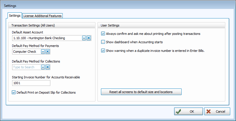 When entering Transactions, you can have specific transaction details appear automatically (by default) as you tab through the fields. Use the Settings button under the Special Functions menu to set these defaults and activate additional features to the Accounting module.