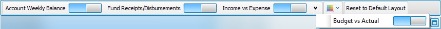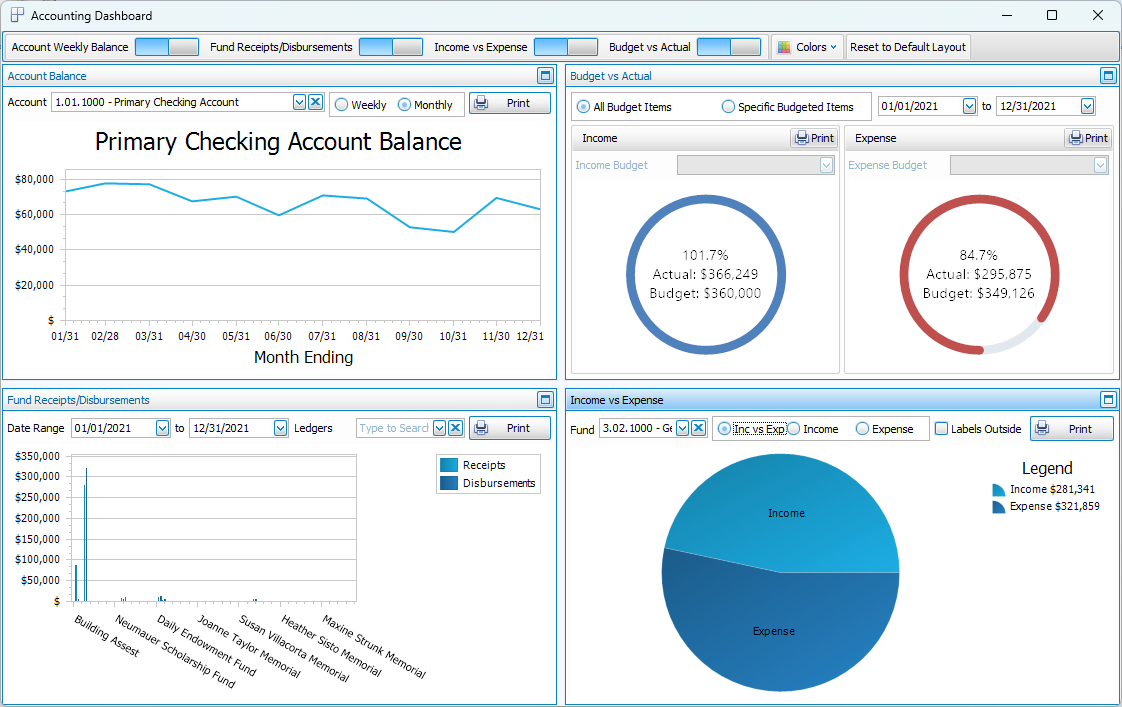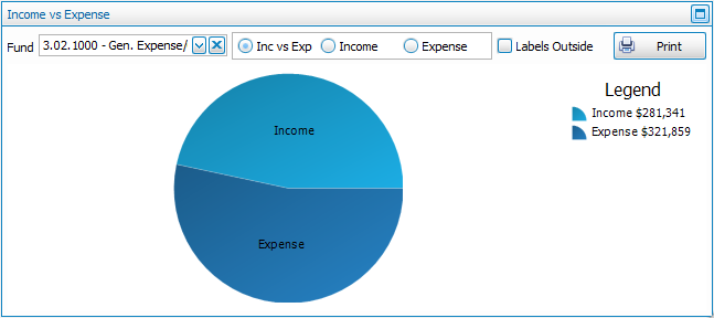 This pie graph provides three display choices for your Funds. Select a Fund from the dropdown and choose to display Income vs. Expenses or a breakdown of Income or Expenses.