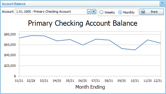 Select any of your accounts from the dropdown to see a simple line graph of the Weekly or Monthly account balance from the beginning of the accounting year through today.