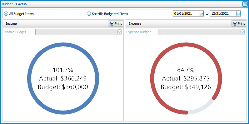Select a date range in the top right to compare actual Income and Expense amounts to your Budgets for all or specific budgets.