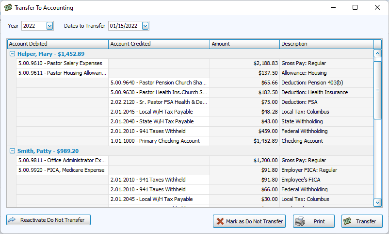 This function allows you to transfer Payroll expenses to your records in the Accounting module. This screen will show each payee and the associated debit and credit accounts for this pay.