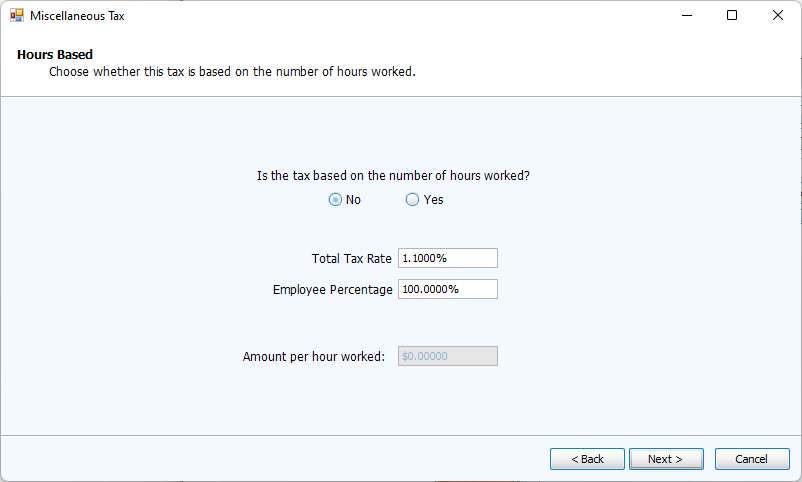 Enter the Tax Rate or Amount per Hour Worked. If the tax is split between employee and employer, enter that percentage.