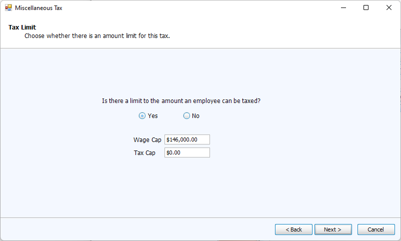 Enter limitations either based on the maximum tax amount or wage cap.