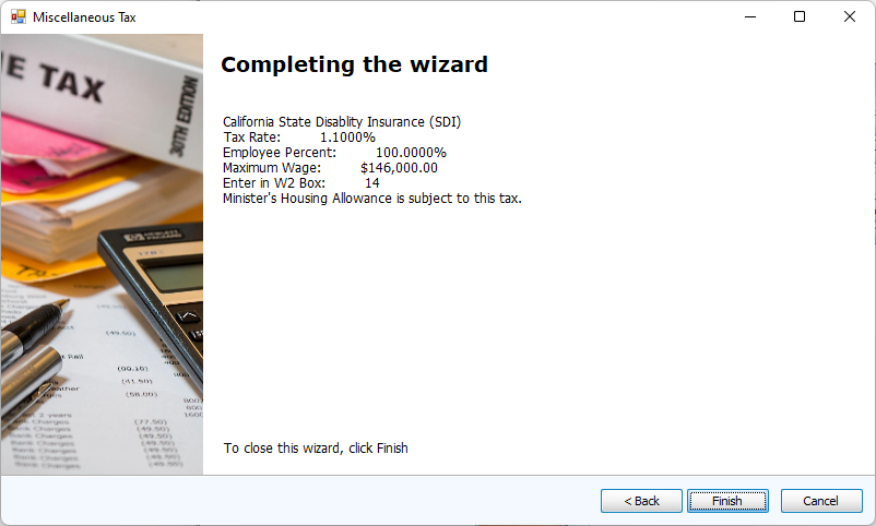The last screen of the wizard will summarize the new Miscellaneous Tax. Click Finish.