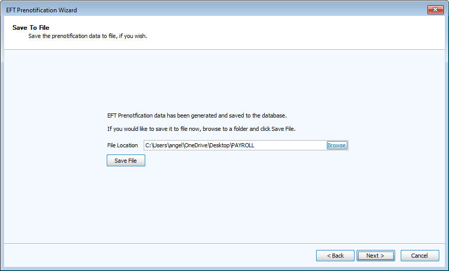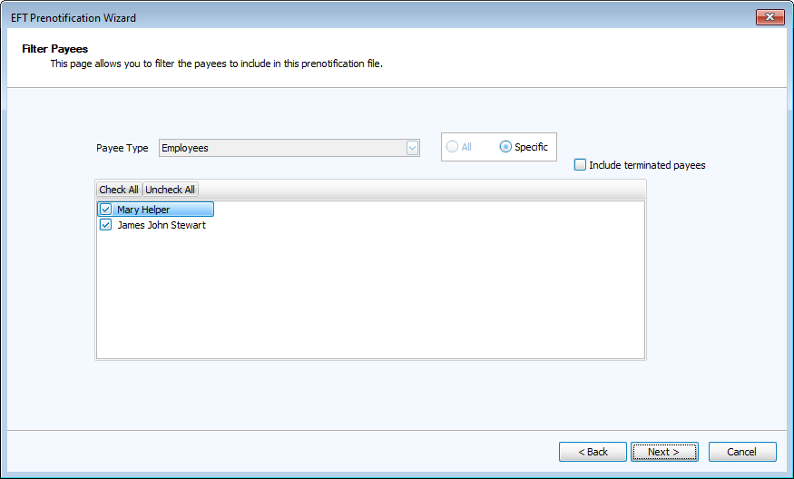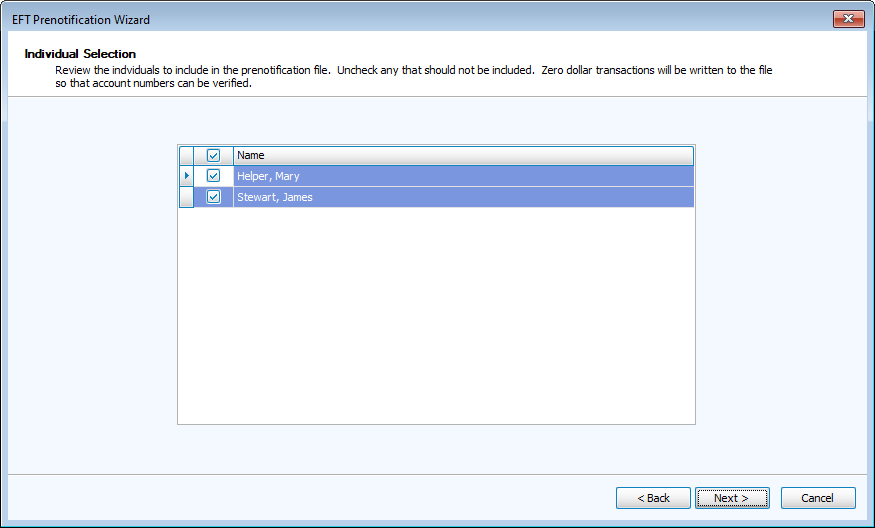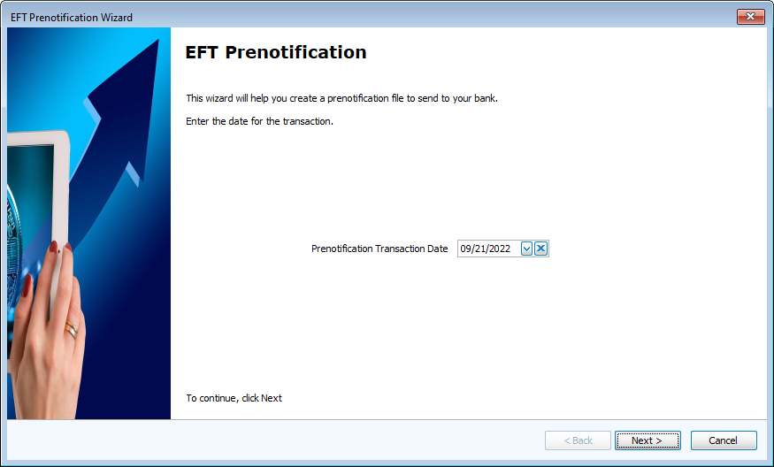 Open the EFT Prenotification Wizard by going to Direct Deposit/EFT > Pre-Notify.