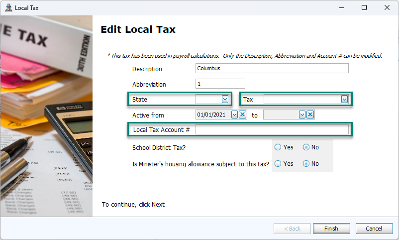 Click OK. Go to Data Setup > Local Tax. Click Edit to fill in the following highlighted fields.