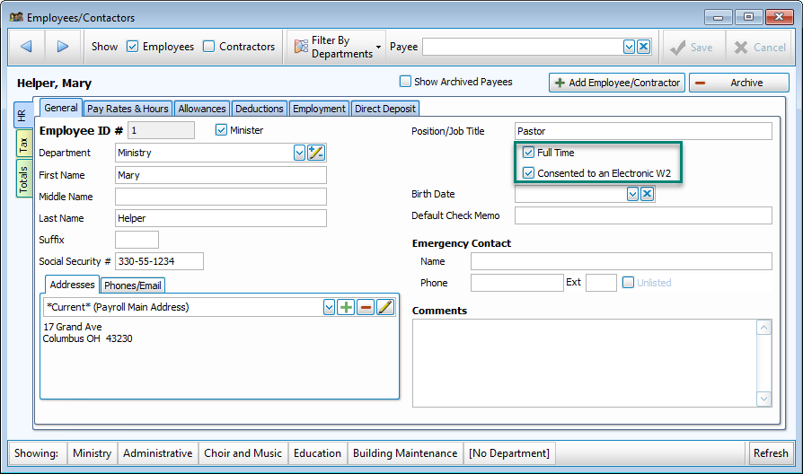 Fields highlighted below in the Employee Files are relevant to electronic filing. These fields are new to this version of Payroll and should be completed for each employee.