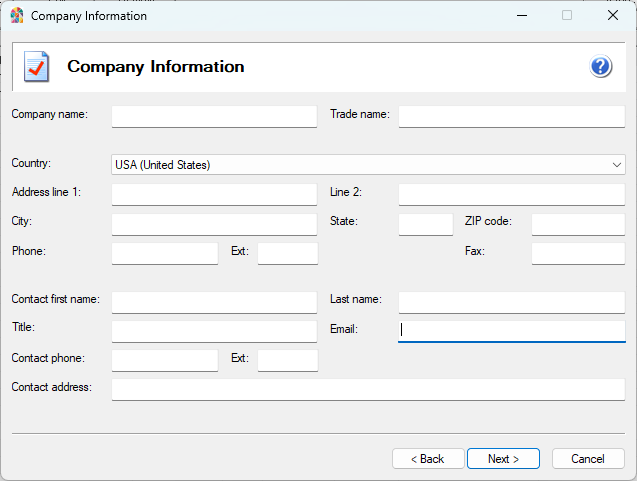 Fill out information about your church. Company Name, Address Line 1, City, State, ZIP, and Phone are required fields.