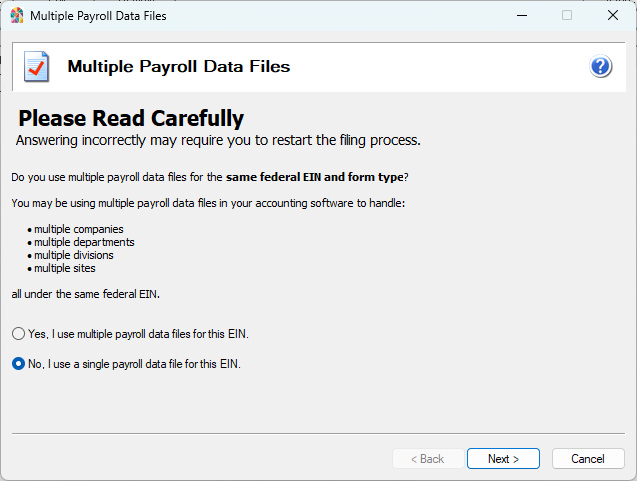 Indicate whether you will have multiple Payroll databases under the same FEIN.