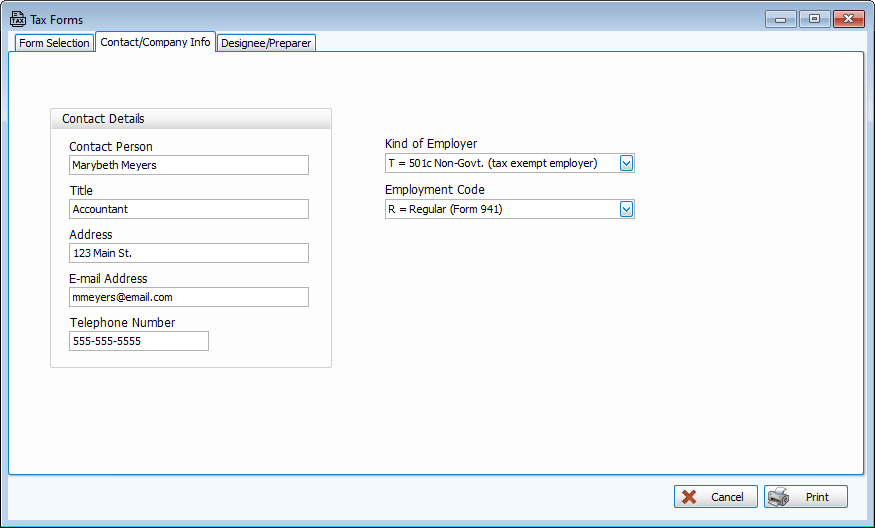 This tab contains the contact information for the person responsible for filings and the 501(c) status and Employment Code.