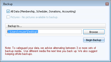 - All Data (Membership, Scheduler, Donations, Accounting) to backup all of the Modules
