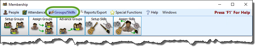 Here, you have options to Set Up Groups and Classes and maintain a list of Skills. Once setup, Managing Group Members using Assign Groups & Skills and Managing Skills / Interests using the Assign Groups / Skills Screen allows you to add individuals in The People File to the applicable Groups / Classes and Skills. Additionally, you can use the Advance Groups / Classes function to "graduate" one class to the next.