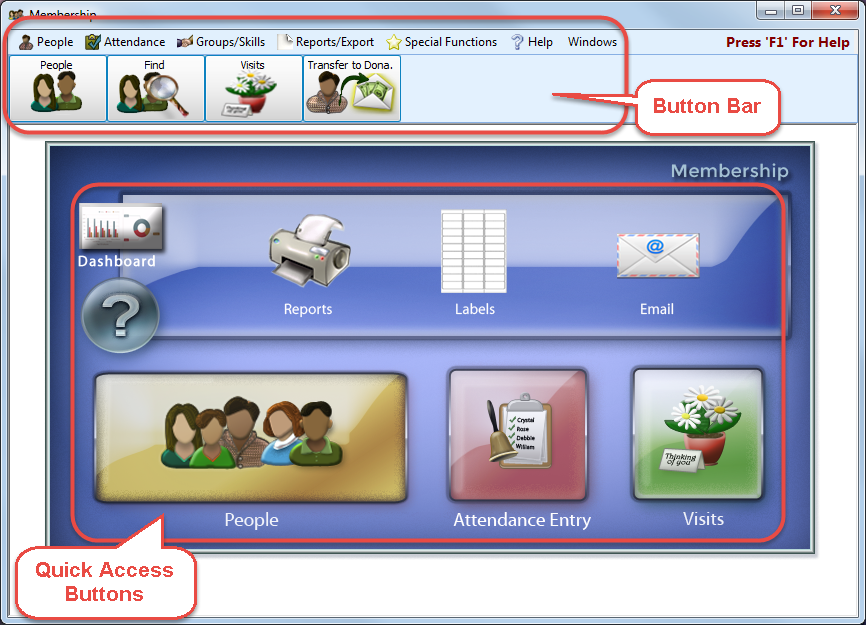 People, Attendance Entry, and Visits — The People File button will take you to your database of family and individual records for Members, Visitors, and other Categories of people. Attendance Entry will take you straight to the screen to record attendance for your Events and Groups / Classes. Visits will take you to the personal visits screen.