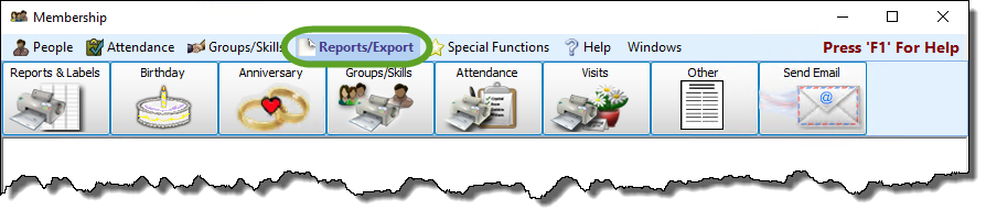 Reports, Labels, and Email — This is now the quickest way to get to the interface for Reports / Directory / Exports, Labels, or Setup Email. There are links to some specific reports through various other screens such as The Find Grid, or attendance reports, but if you just need to get directly to specific Membership reports to print, export, or email, this is the best method to use to get to each of them.
