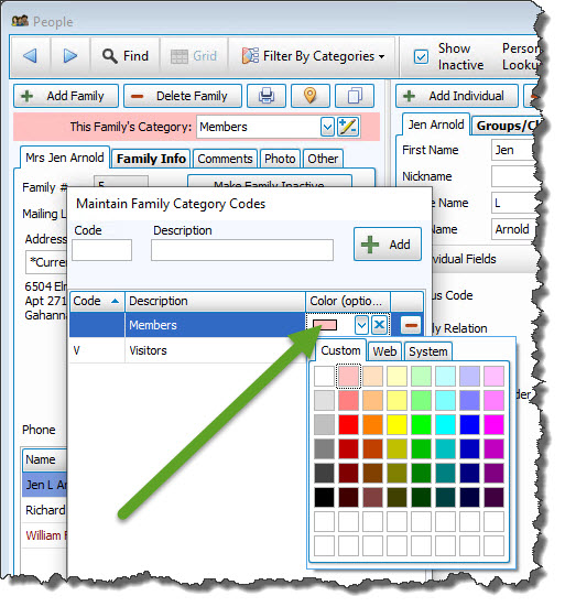 To add a highlight of color to help you quickly differentiate between Categories while browsing The People File, click your mouse in the rectangle in the Color column and choose a color (pastels are recommended for best visuals), for example: