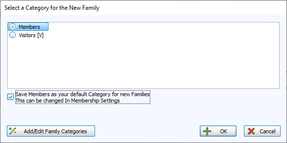 Once you select a category, you will have the option of saving that Category as the default Category for new Families by checking the box that appears. This setting is specific to each of your Users and can be changed at any time in Membership Settings.