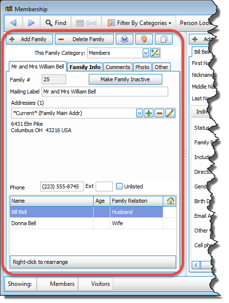 In The People File of Church Windows Membership, the Family record contains all of the information that pertains to all members of that family. It is possible to change or update this information at any time as needed, by simply making the necessary change in any Family Record Fields. Changes are saved automatically as they are made, however there a Save button you can click if it makes you feel more secure.