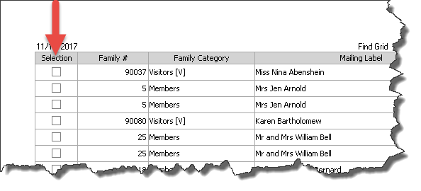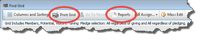 In Church Windows Membership, from The People File, you can print reports and labels, create a custom report, create mail-merge files, and export data from The Find Grid. In working from the Grid, you can choose exactly which records or group of records you would like to print or export. You can print the information from all of the records on the Grid, or you may select only certain records to print.