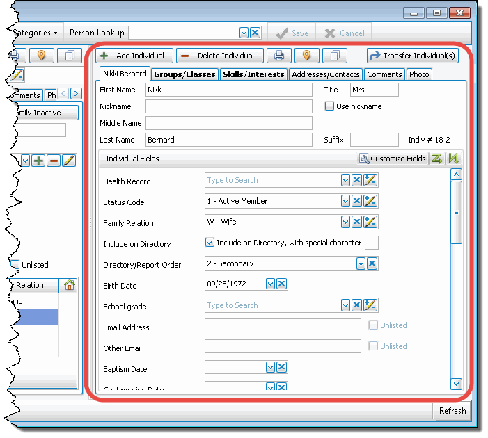 In Church Windows Membership, the Individual record contains all of the information that pertains to one specific person. It is possible to change or update this information at any time as needed, by simply making the necessary change(s) in any Individual Record Fields. Changes are saved automatically as they are made, however there a Save button you can click if it makes you feel more secure.