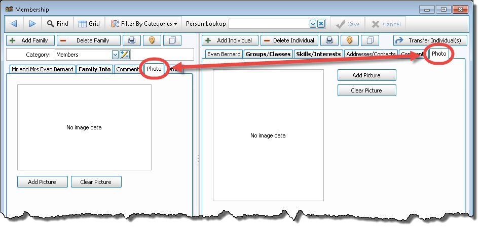 If you have assigned the family photo to the 1 — Primary person, as in previous versions of Church Windows, use the Indiv / Family Pictures tab in Settings to move that photo to The Family Record.