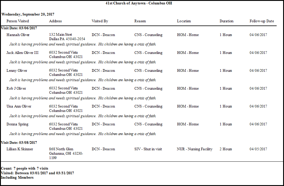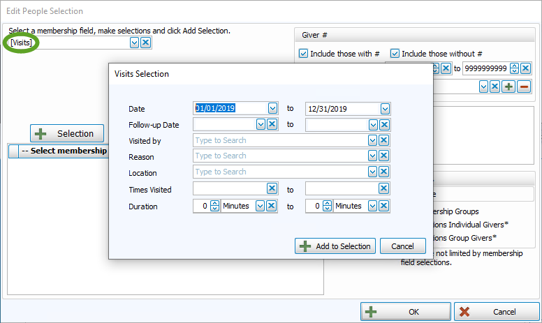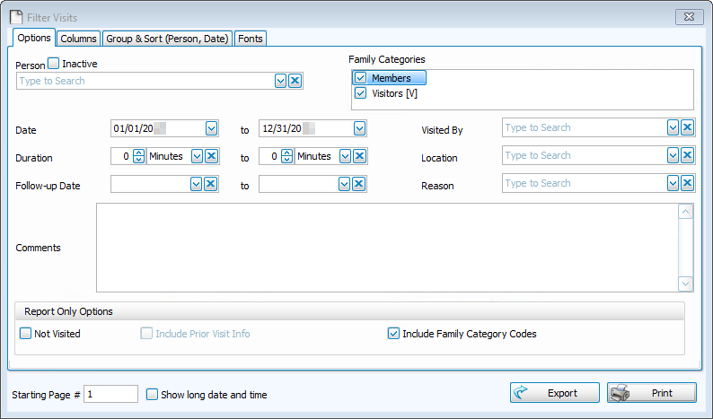 - This will allow you to limit the report to people who meet the criteria you enter on this window, if you want to print a Visits Report for a single person, use method 2 or 3 instead, explained below.