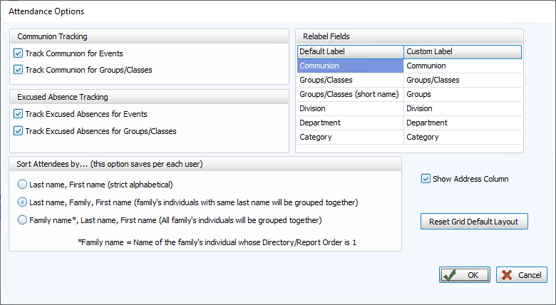 - For both Events and Groups / Classes, you can choose to track Communion, Excused Absences, both, or neither.