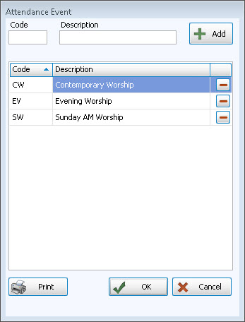 For example, you could enter SW9 for the code and "Sunday worship 9AM" as the description for your Sunday worship at 9:00.