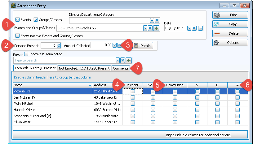 The Attendance Entry screen will appear. Follow the numbered steps explained below to enter your attendance: