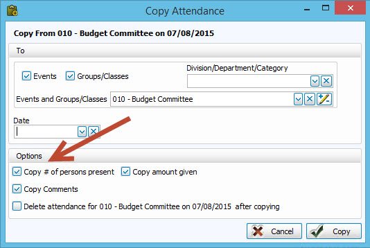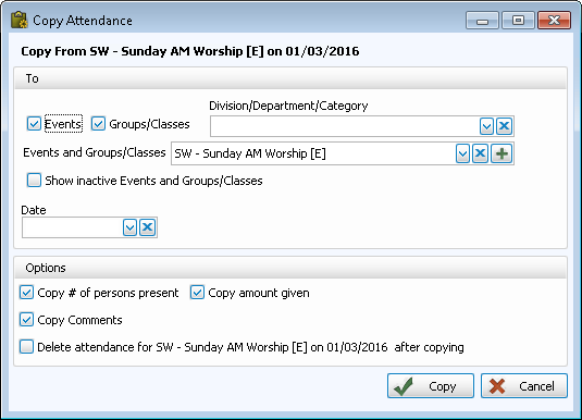 - The Event / Group / Class and the date you entered you are copying the attendance from are listed under the From section.