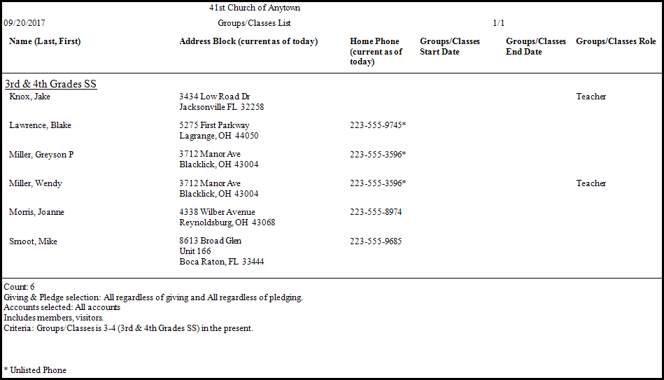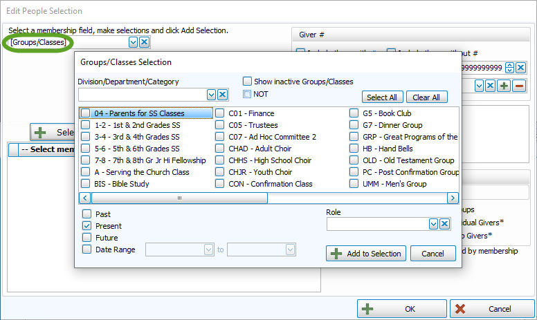 In either method, you may limit the Groups/Classes selection to any combination of Past, Present, or Future members by