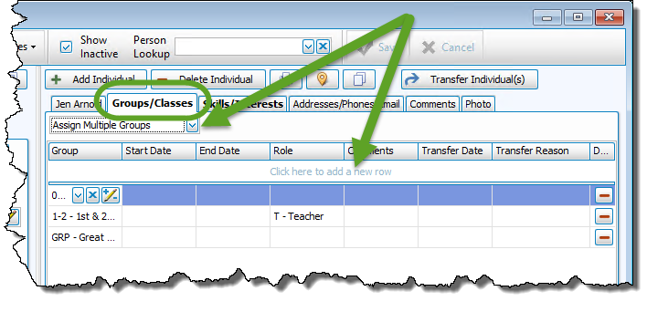 dropdown button to see a list of all the Groups / Classes set up in your system. Select the Group / Class you wish to assign to this individual's record. - Press TAB on your keyboard or click to continue through the other columns (see below) adding any information you have until the row moves down to the lower portion of the screen.