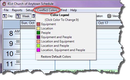 To figure out what each color represents, click Conflict Colors at the top of the Scheduler screen to open a legend showing the colors and what conflict they indicate. If you like, you can change the color assigned to a specific conflict type.