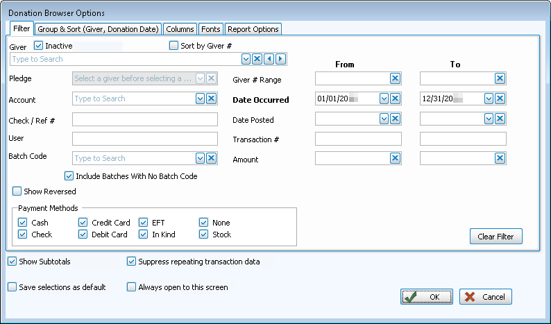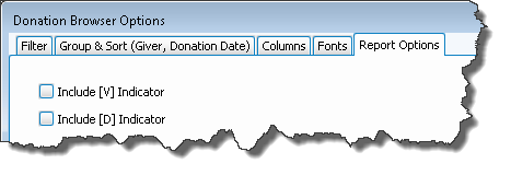 If you plan to print donations from the Browse Donations screen, place a checkmark in this box to show a subtotal for each set of donations in the report.