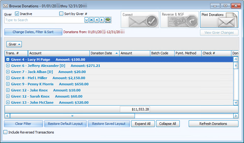When finished, click the OK button to display the list of donations determined by the information you entered on the Donation Browser Options screen.
