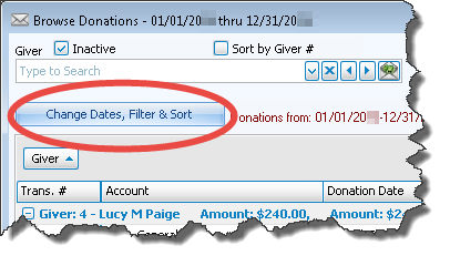 If you would like to re-adjust the information that displays on the Browse Donations screen, click the Change Dates, Filter & Sort button again, make your changes, and click OK. The contents on the Browse Donations screen will re-adjust according to the changes you make each time.