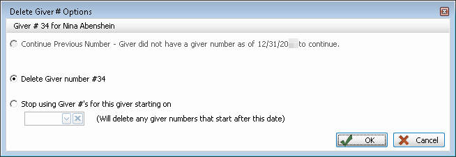Use the Manage Giver Numbers screen to change or remove the number already assigned to a Giver. If you are changing or removing numbers for many Givers, it would likely be more efficient to use .