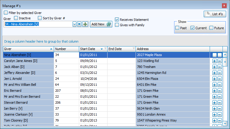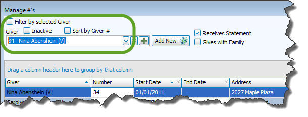 • In the upper right corner of the Manage Giver Numbers screen, you can specify what Giver Numbers the screen should display.