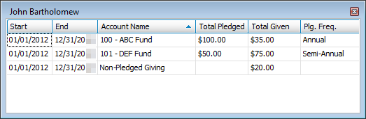 Pledge / Giving buttonIf you wish to see a short log of what the selected Giver has already donated and pledged, click the