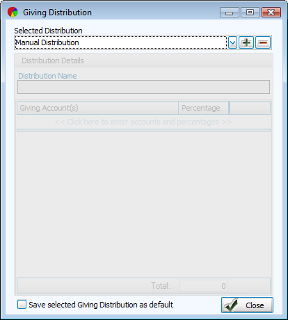 For example, if your Church has a way of making a specific Giving Distribution to separate accounts by percentage of the total amount that the Giver donates, you can apply that distribution on this screen.