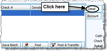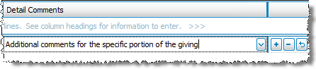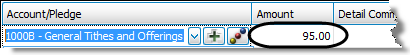 Once you make an Account selection, the dollar amount entered in the first Amount box in Step 7 will appear in the Amount box next to your selection. If needed, change the amount of money that the Giver is donating to the selected Account in the Amount box. - Detail Comments