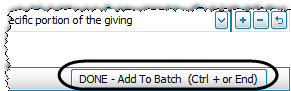 - When you have added all of the details for the specific Giver's donation, click the Done — Add To Batch (CTRL + or End) button (or hit either the CTRL and + keys, or the End key on the keyboard):
