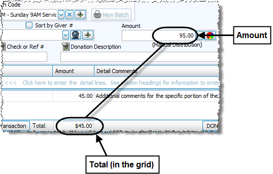 The amount that goes in this box is the total of all that the Giver donates for all the purposes put together for the specified date. In other words, a Giver might have donated $45 for General Giving and $50 for the Building Fund. In this box, you would enter $95. How that is separated is handled by the Giving Distribution.