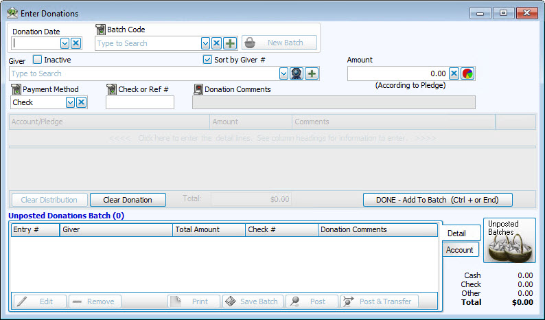 Use the Enter Donations screen to enter the money that Givers donate to your Church and its purposes / campaigns into the software. Through the Enter Donations screen, gather the donations into a batch and post the batch. The software will then update the donation records for the Givers with the information you entered.
