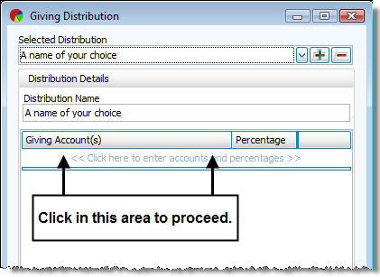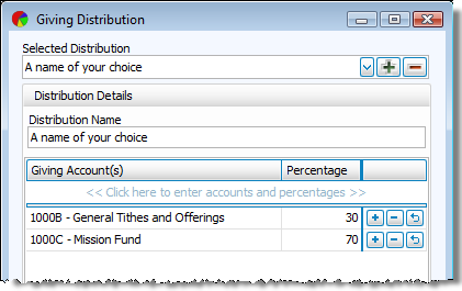 - Press OK and the Giving Distribution screen will make space available for you to enter the accounts and the percentage portions.