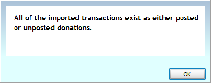Each entry will have a Donation Date, a Giver, an Account, and an Amount. - Click the Create Donations button in the top right and the Imported Batches screen will show you the batch dates detected in the import file. The system will not duplicate identical transaction; if all of the transactions have previously been imported the following message will appear: