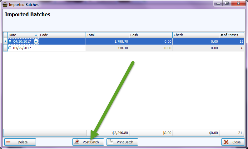 - Click to select each batch you have imported and click the Post Batch button to finalize a posting of the imported batch(es) of donations:
